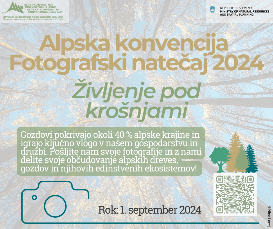 Ministrstvo za naravne vire in prostor v sklopu slovenskega predsedovanja Alpski konvenciji skupaj s Stalnim sekretariatom Alpske konvencije razpisuje letošnji fotografski natečaj Življenje pod krošnjami. Fotografski natečaj poteka od junija do septembra, oddane fotografije pa se potegujejo za mesto na koledarju Alpske konvencije za leto 2025, najboljše tri pa za denarne nagrade.