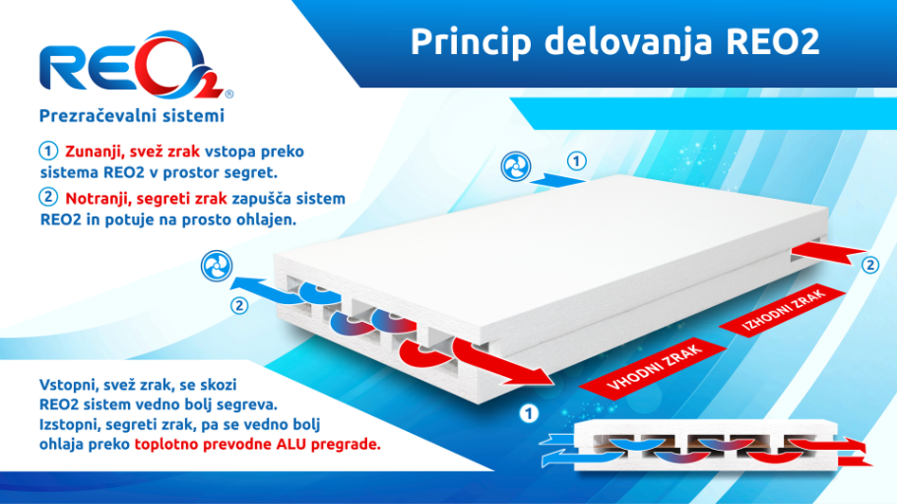 REO2 je edinstven dvocevni lokalni prezračevalni sistem z rekuperacijo, ki z učinkovitim, varčnim in tihim zračenjem bivalnih in poslovnih prostorov, uporabnikom zagotavlja sveže in zdravo notranje okolje brez vlage, slabih vonjav ali plesni. Zaradi učinkovitega ter inovativnega sistema vračanja toplotne energije iz izrabljenega na svež vstopni zrak, nizkih stroškov izdelave in dolge življenjske dobe, je REO2 sistem obetavna novost za širše svetovne trge. Sistem je patentiran pri URS-IL pod št. 25751.