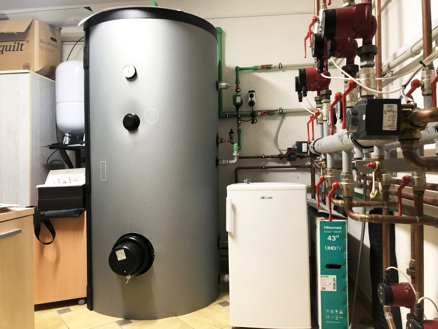 Celotna stavba je podkletena, v kleti pa se nahaja tudi sodobno urejena kotlovnica, ki skrbi za ogrevanje obeh objektov. Stavbi se ogrevata na biomaso, kar rezultira v nizkih ogrevalnih stroških.